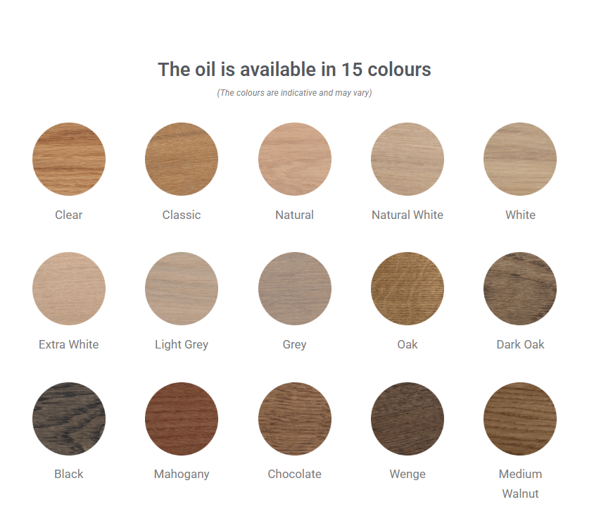 Clear, Classic, Natural, Natural White, White, Extra White, Light Grey, Grey, Oak, Dark Oak, Black, Mahogany, Chocolate, Wenge, Medium Walnut